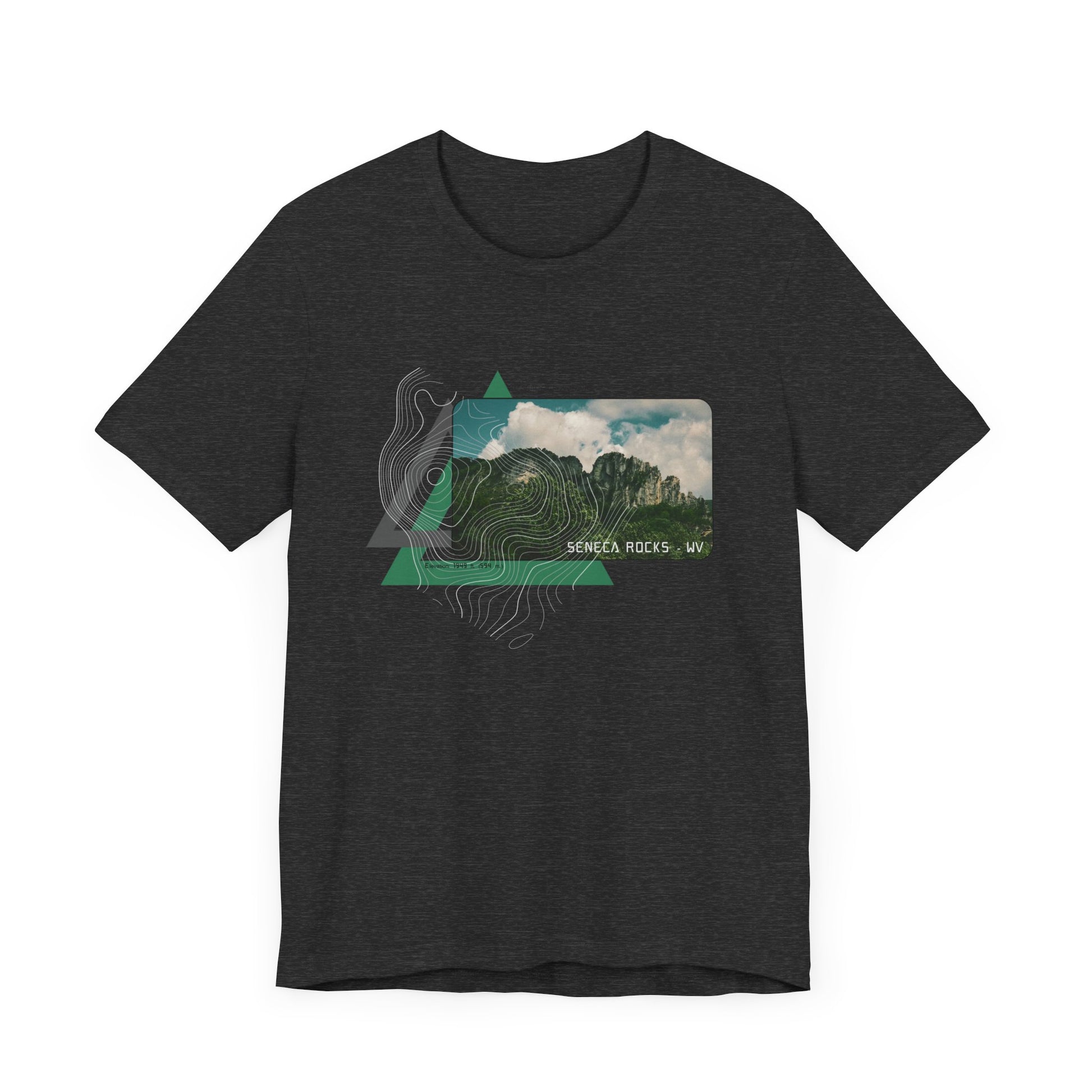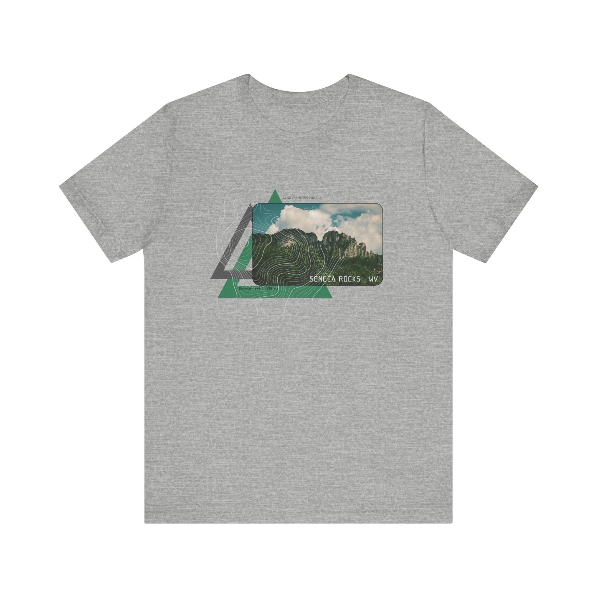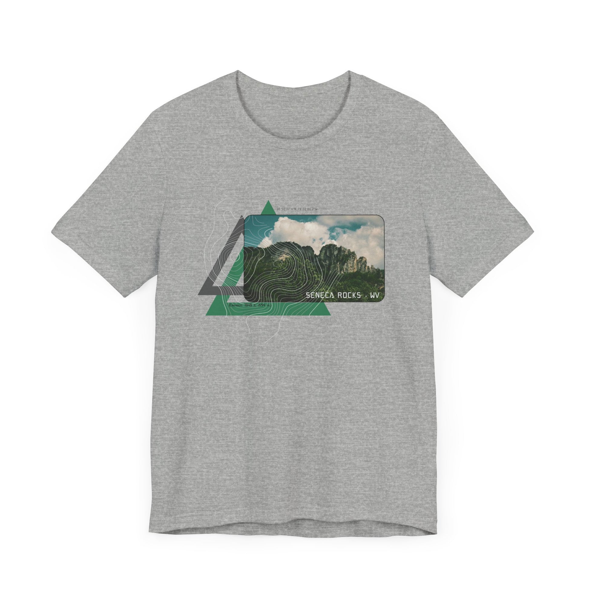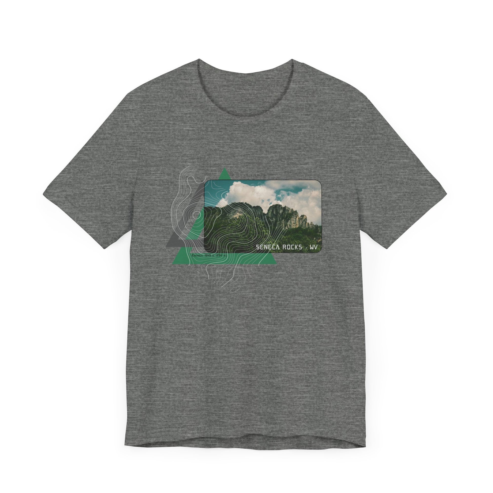 Soft, worn-in cotton, just like the one you pulled out of your pack after a long day of scrambling up the spine of the rock. Screen-printed with a subtle, timeless rendering of Seneca Rocks at sunset, the orange and pink hues melting into the twilight sky.