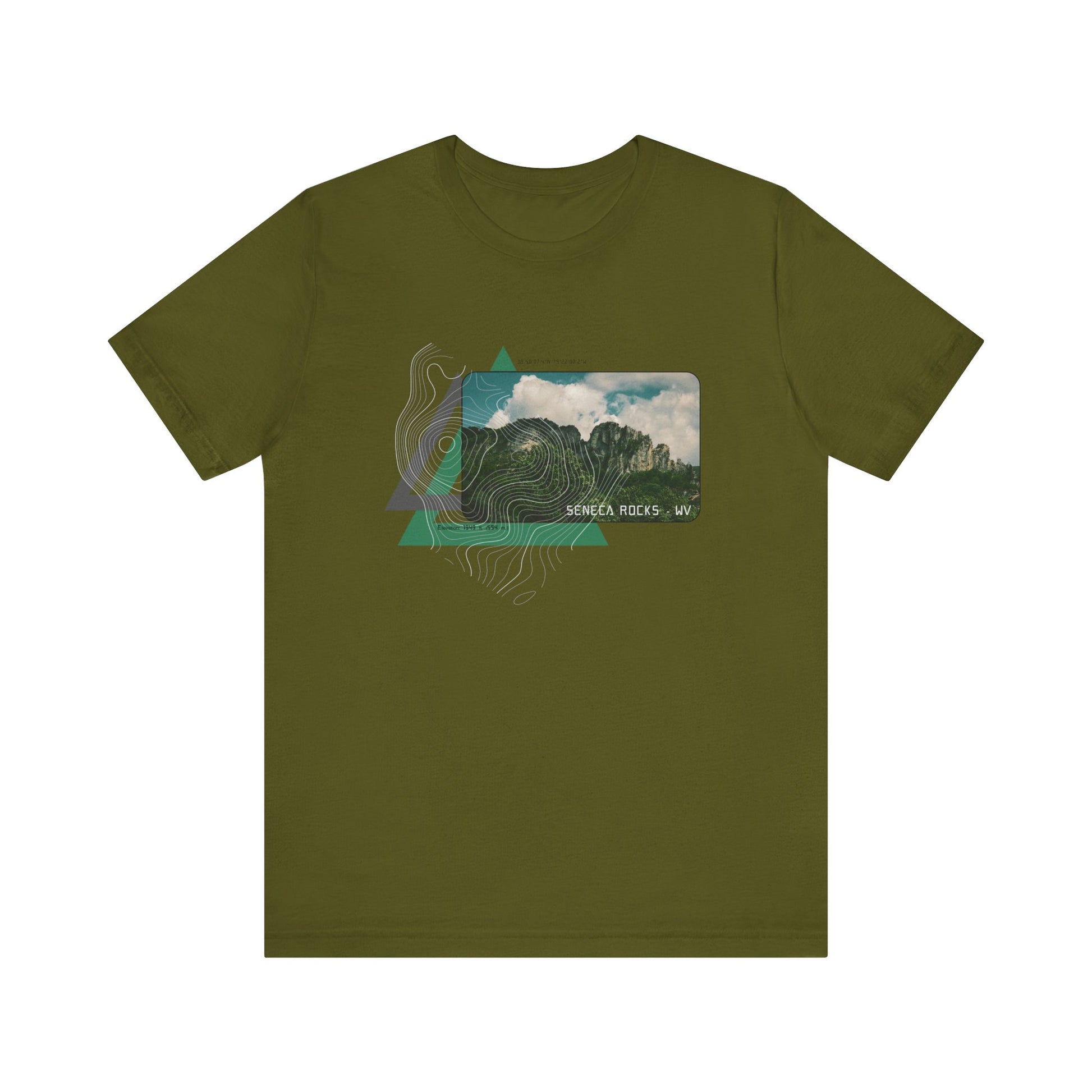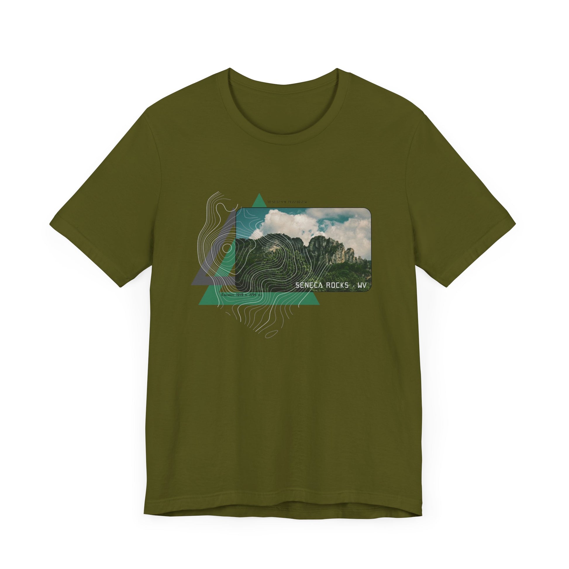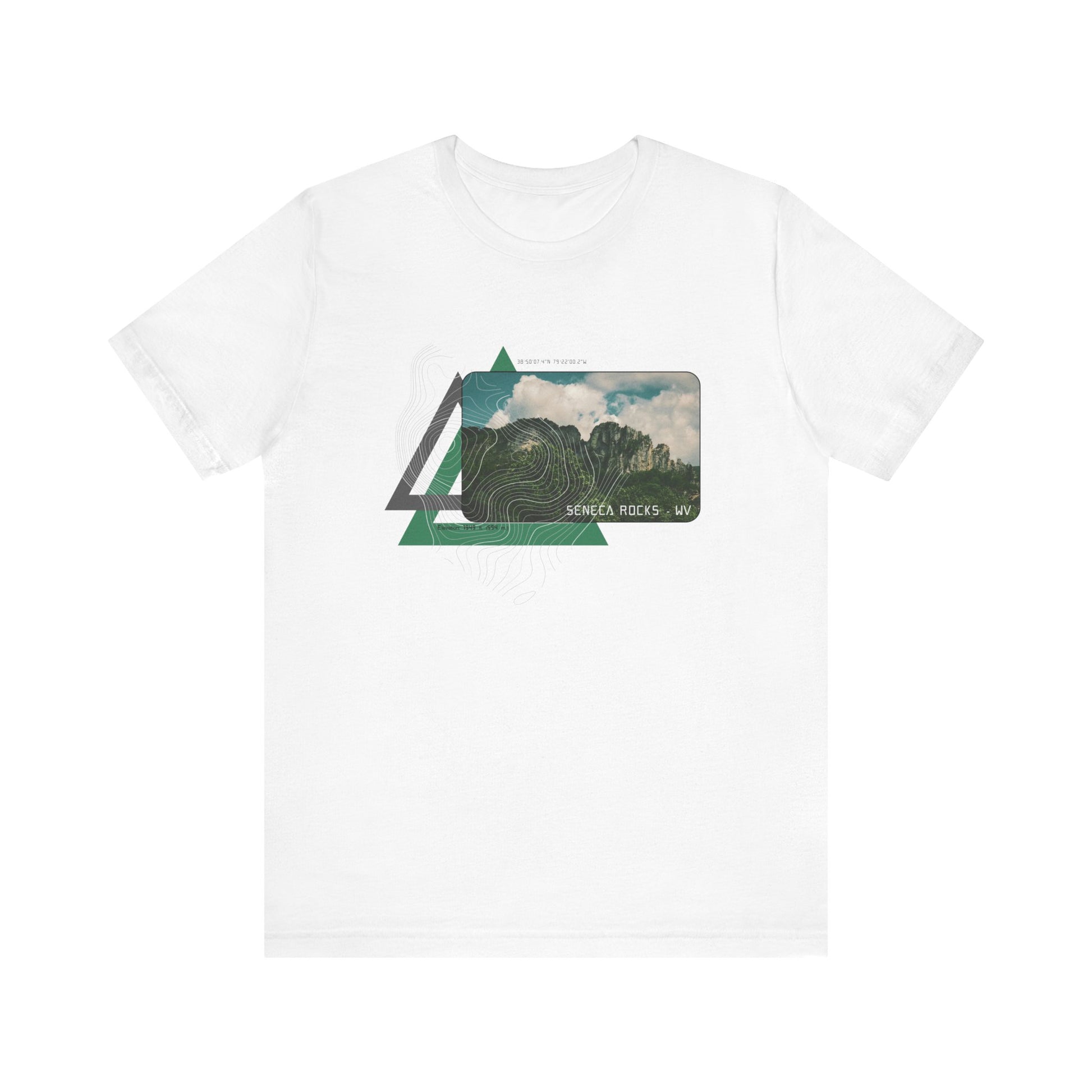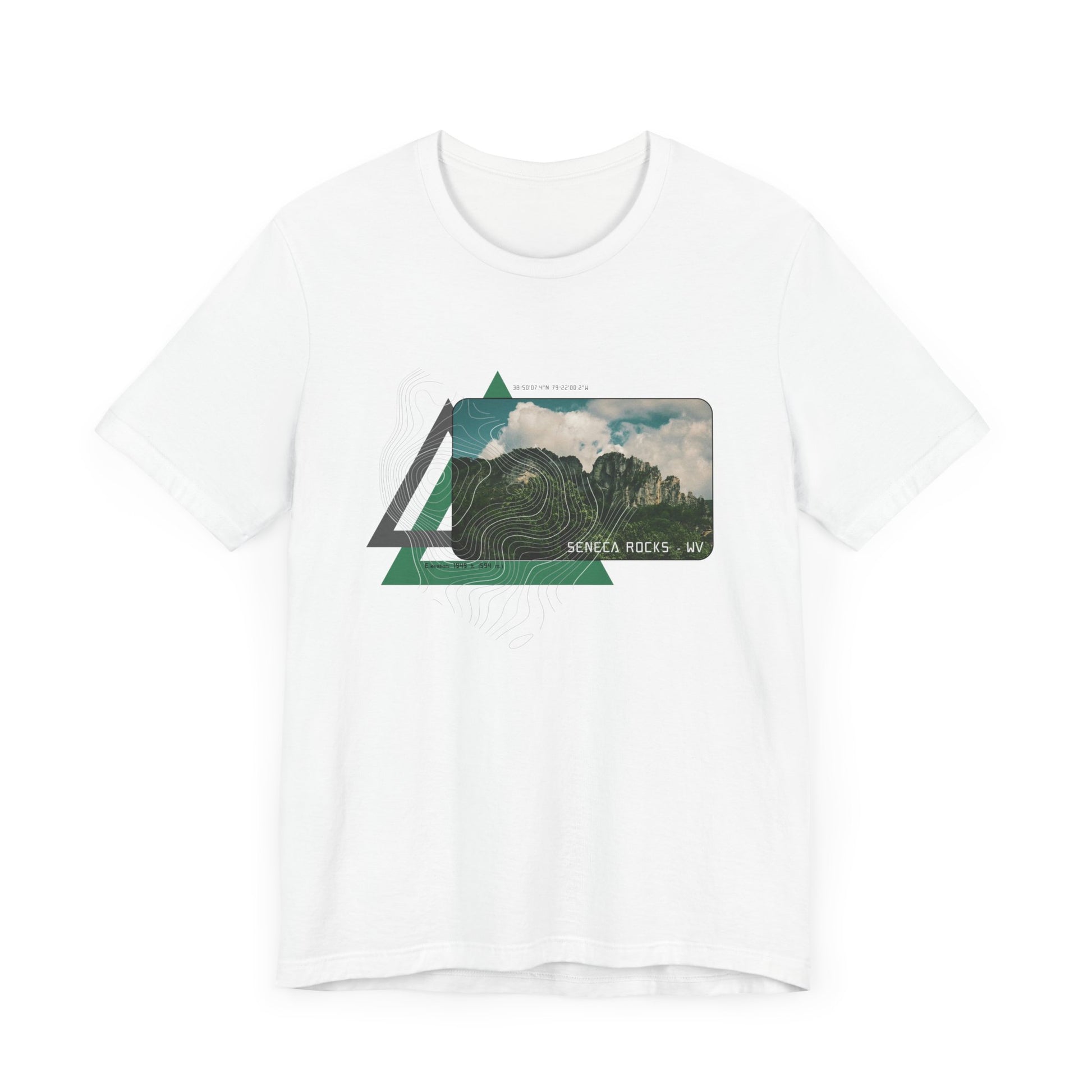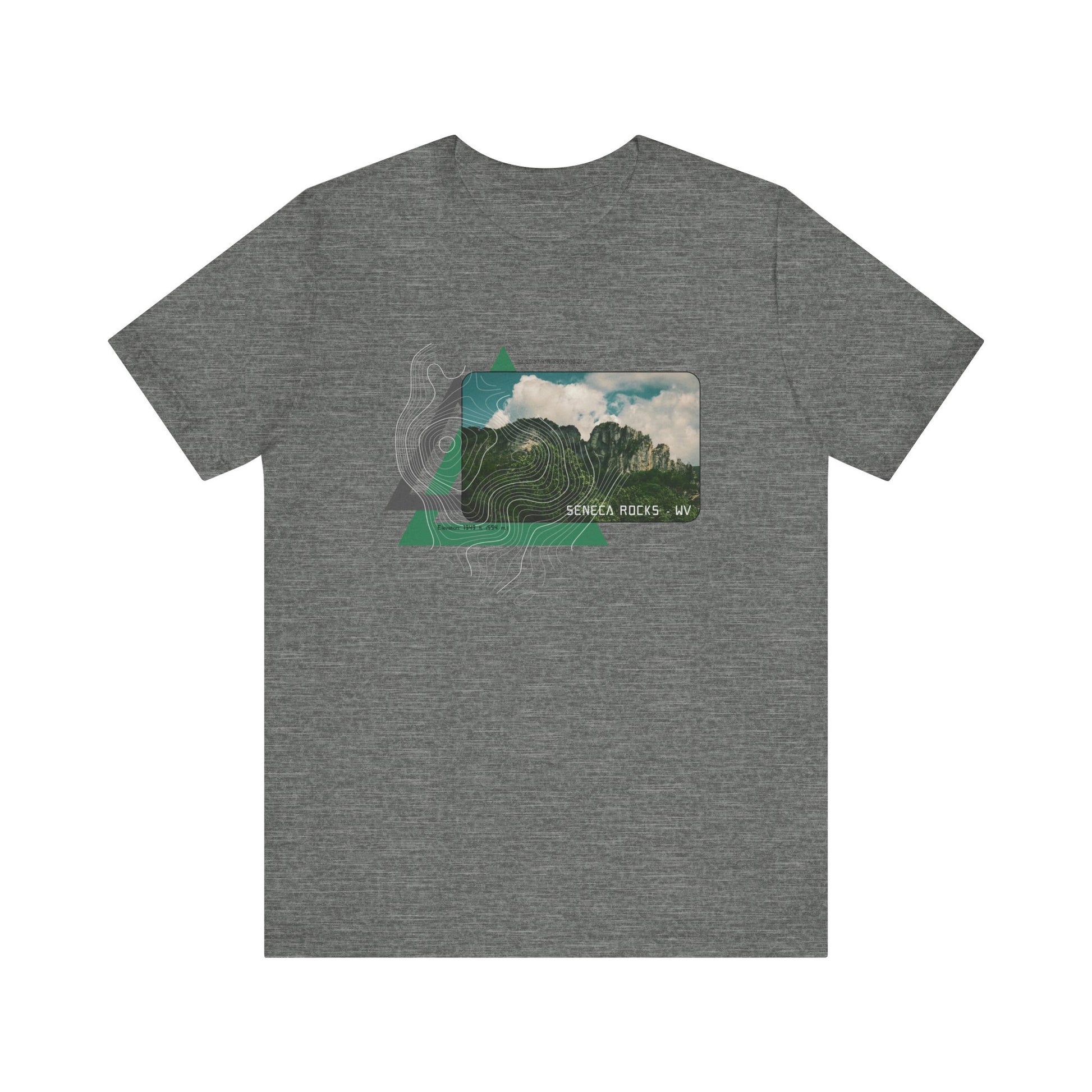Soft, worn-in cotton, just like the one you pulled out of your pack after a long day of scrambling up the spine of the rock. Screen-printed with a subtle, timeless rendering of Seneca Rocks at sunset, the orange and pink hues melting into the twilight sky.